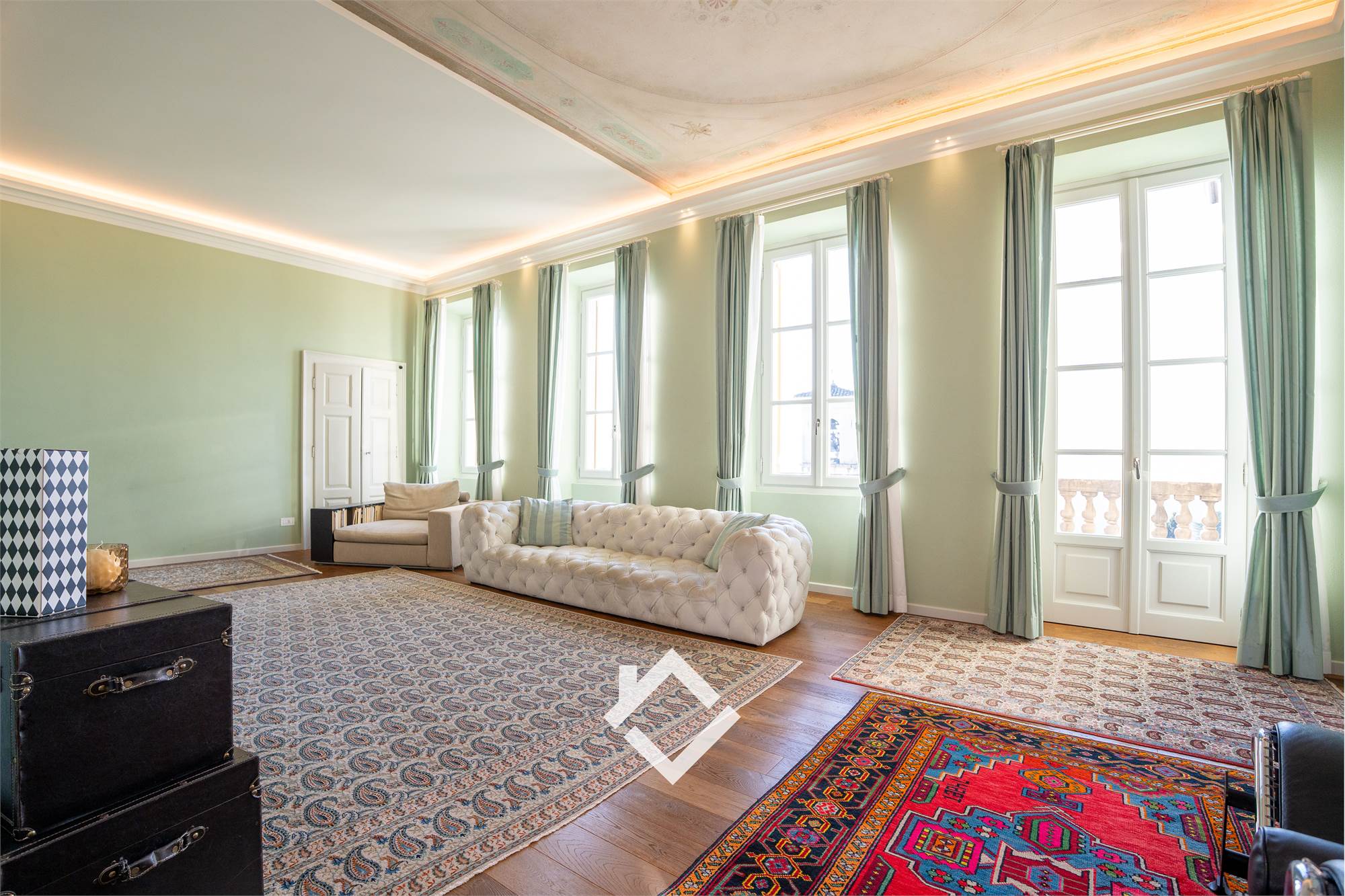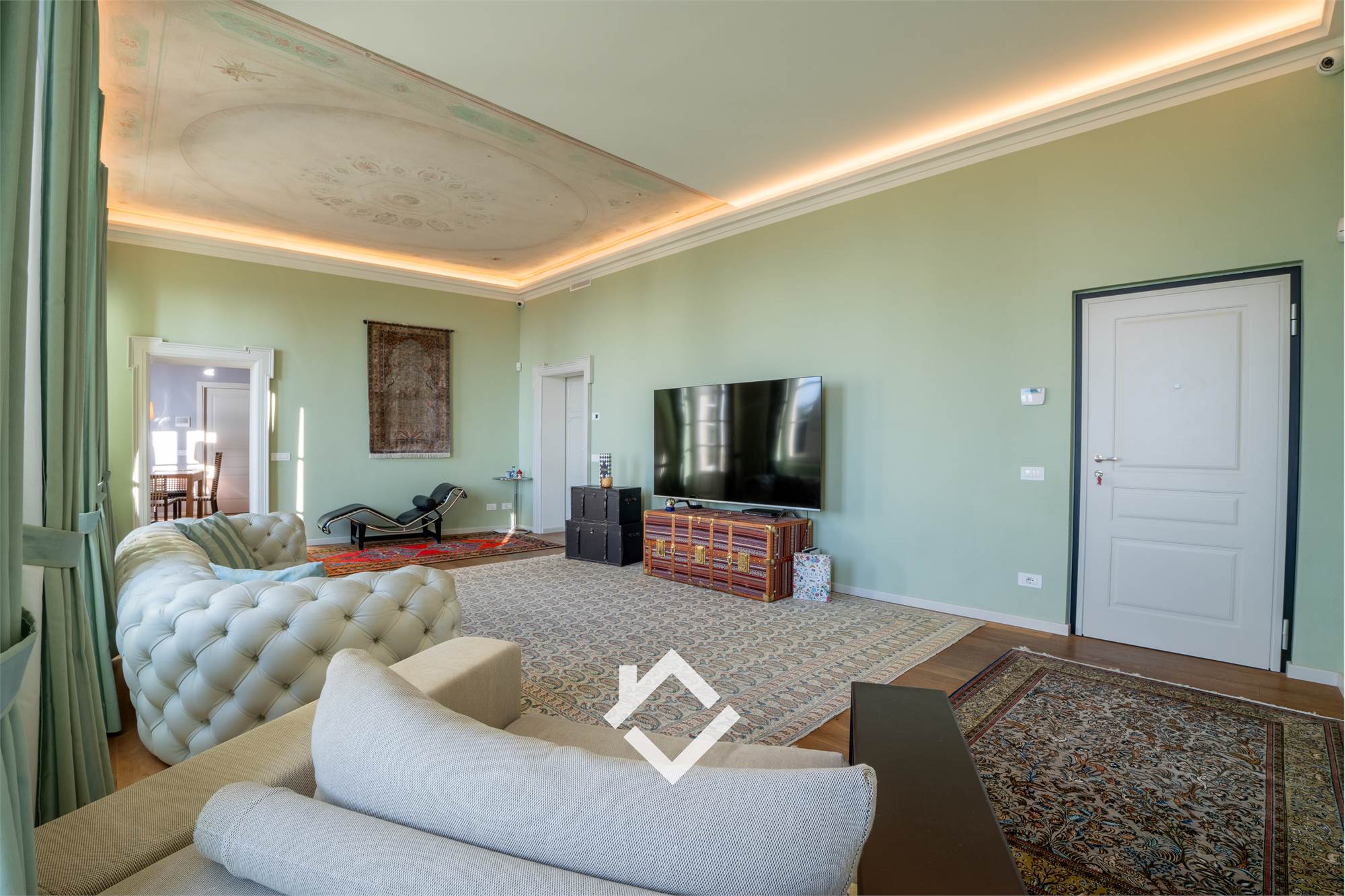L’ingresso, ampio ed accogliente, introduce al cuore della casa: un soggiorno raffinato e luminoso, dallo stile unico, impreziosito da soffitti affrescati. Da qui si accede ad un terrazzo panoramico, ideale per godere di una splendida vista. Una piacevole sala da pranzo con camino, intima e suggestiva, offre un ambiente ideale per trascorrere pranzi e cene con amici e familiari.