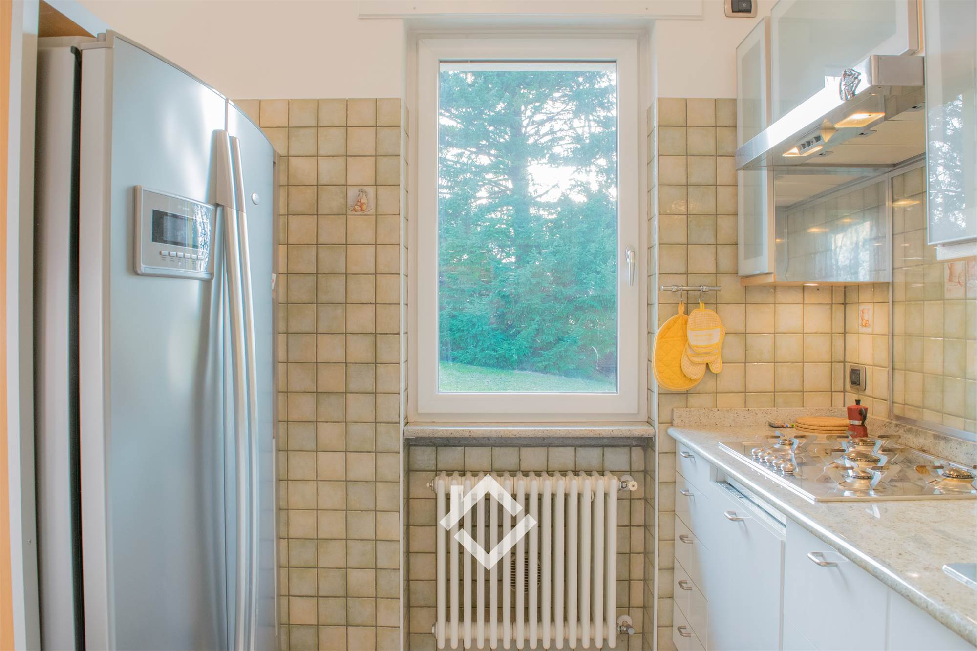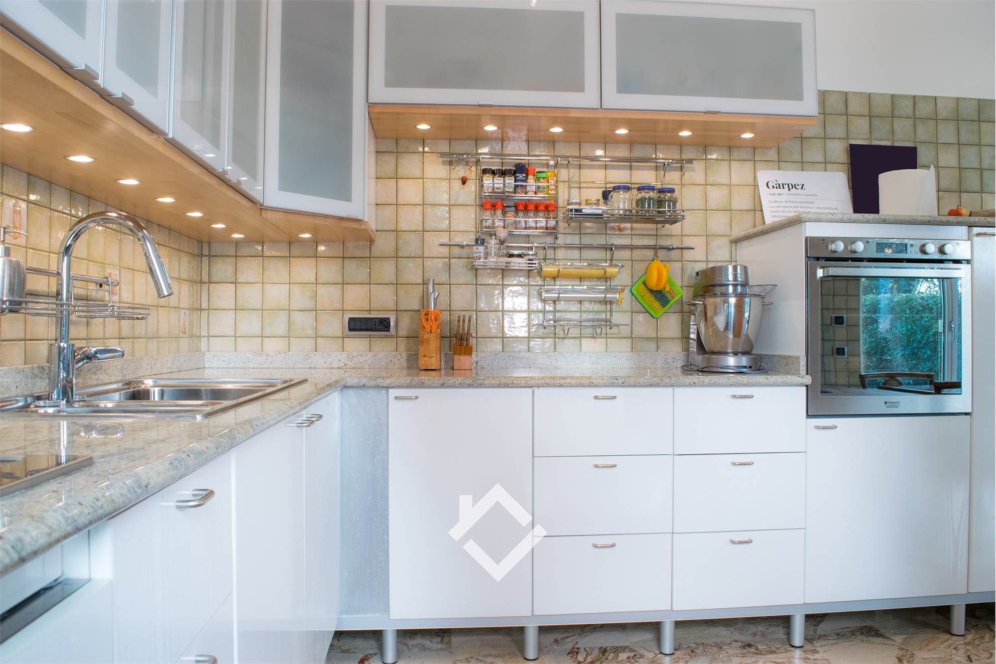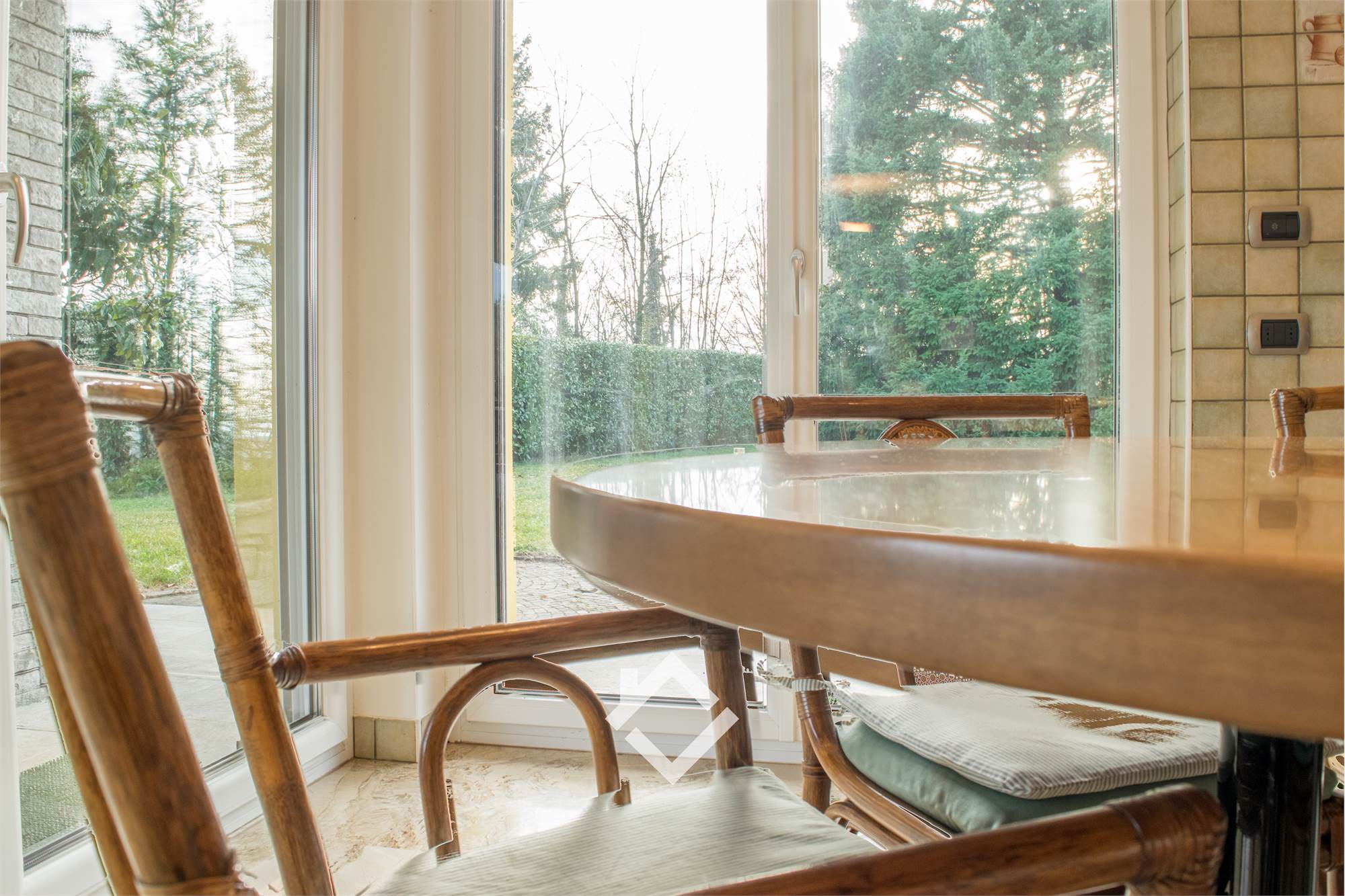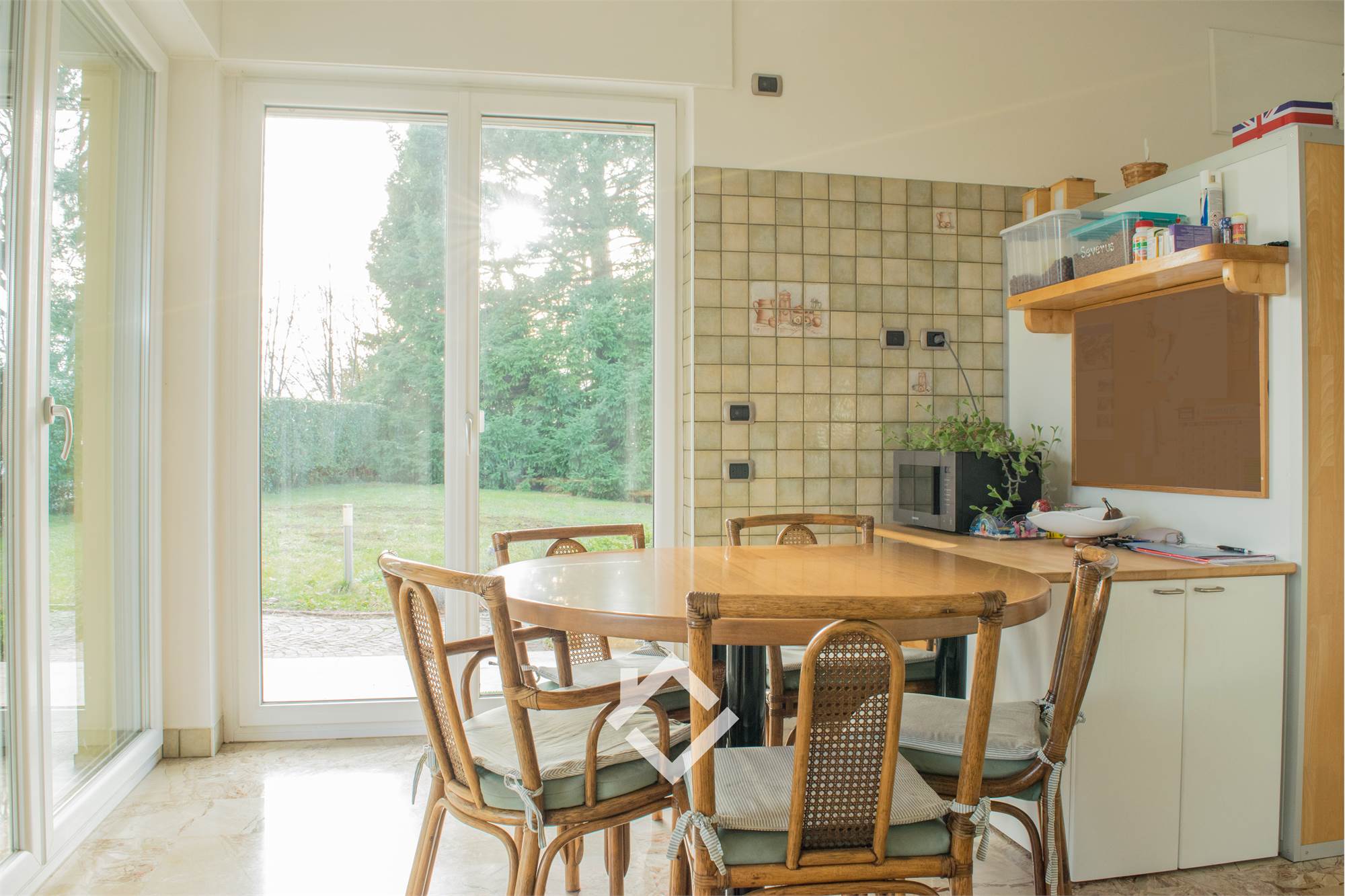 La cucina, separata da una porta scorrevole, offre spazi generosi e funzionali con affaccio diretto sul giardino privato di circa 6.000 mq.